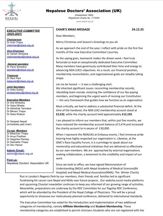 On 20th of January 2026, I signed a Memorandum of Understanding (MoU) on behalf of NDA (UK) with Cancer Care Nepal for collaborative research in cervical cancer. The agreement was witnessed by Dr Sashakta Thapa, with senior oncologists Dr Madan Piya, Dr Sandhya Chapagain, and Dr Rashmey Pun Gurung also in attendance. I have also been invited to deliver a talk on NDA (UK) at their conference as Guest of Honour.