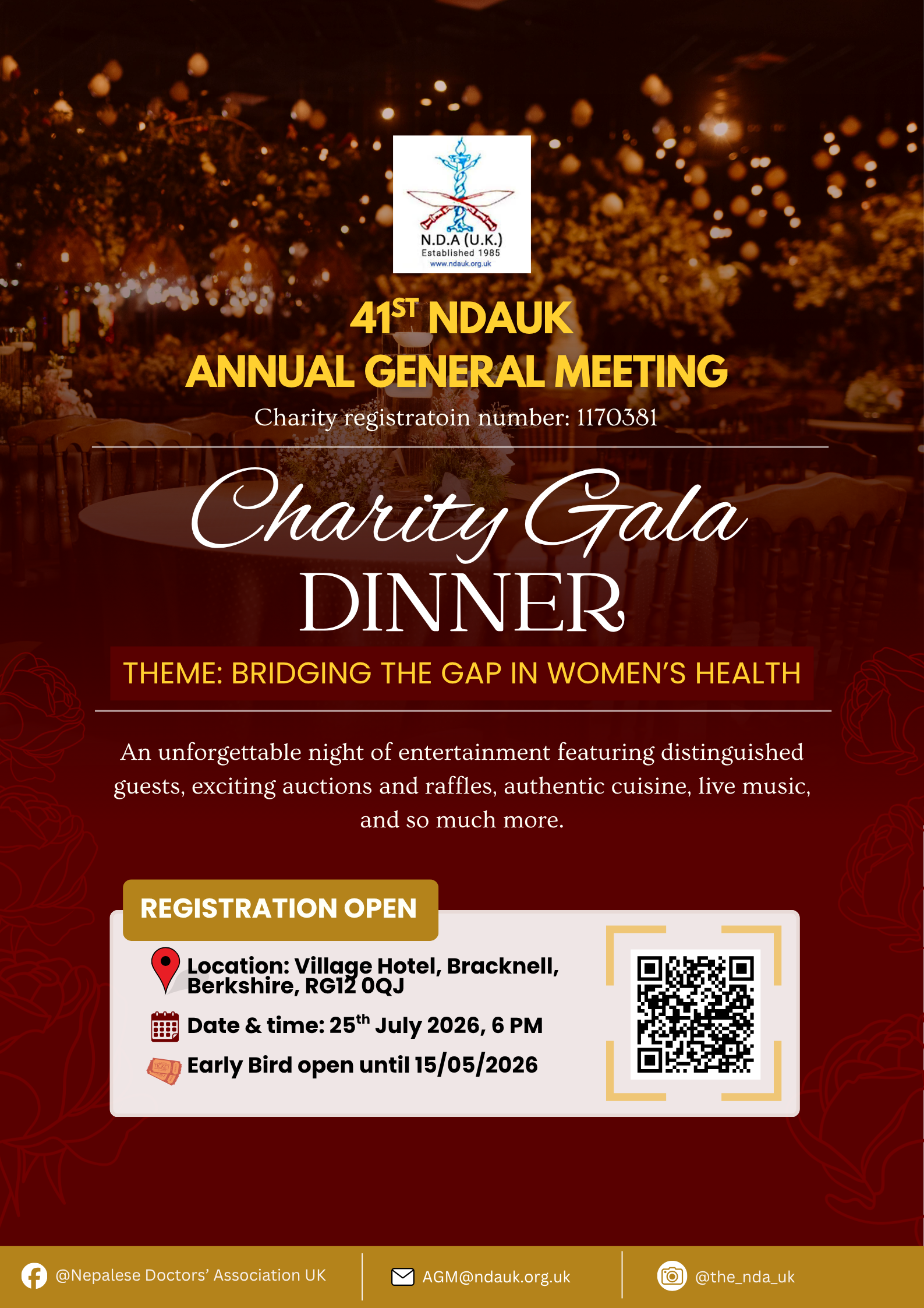 On behalf of the Nepalese Doctors’ Association (UK) and the Local Organising Committee, it is my privilege to welcome you to the 41st Annual General Meeting, hosted this year at the Village Hotel in vibrant Bracknell, nestled in the picturesque county of Berkshire, close to the magnificent Windsor Great Park, historic Windsor Castle and the distinguished Victoria Barracks.